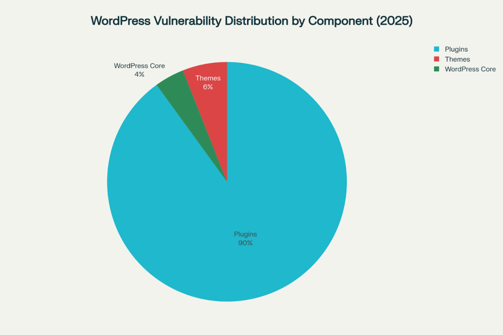 What makes these statistics even more concerning is the source of these vulnerabilities. Plugins account for 90% of all WordPress security issues, while themes contribute 6% and WordPress core itself only 4%. This means the very extensions that make WordPress so powerful and flexible are also its greatest security weakness.