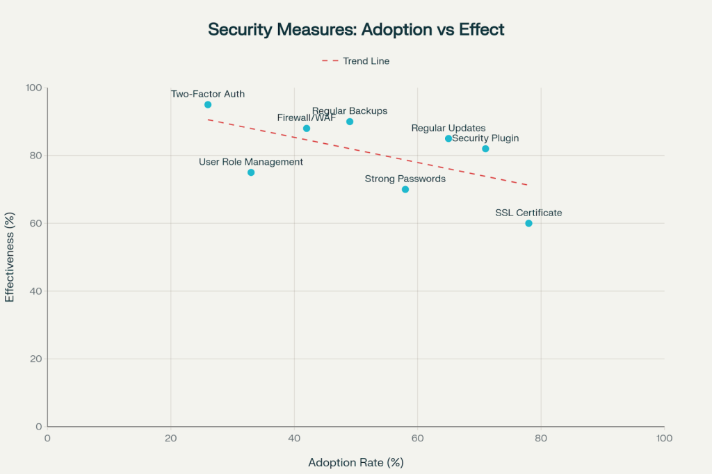 Scatter plot comparing adoption rates and effectiveness of various WordPress security measures, revealing gaps between what’s most effective and what’s most adopted